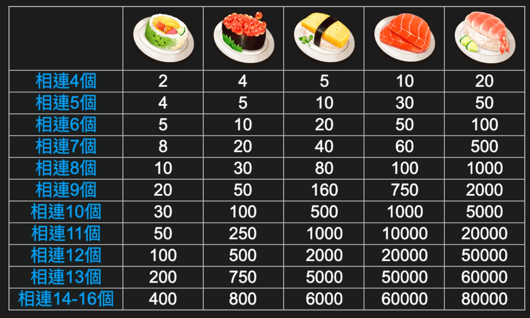 每層盤面隨機派發不同的壽司符號及「過關符號」,玩家需持續連線清除,累積15個過關符號即可進入下一層。第三層過關後將重新回到第一層,讓整個遊戲過程有如無限壽司饗宴,樂趣持續升溫!