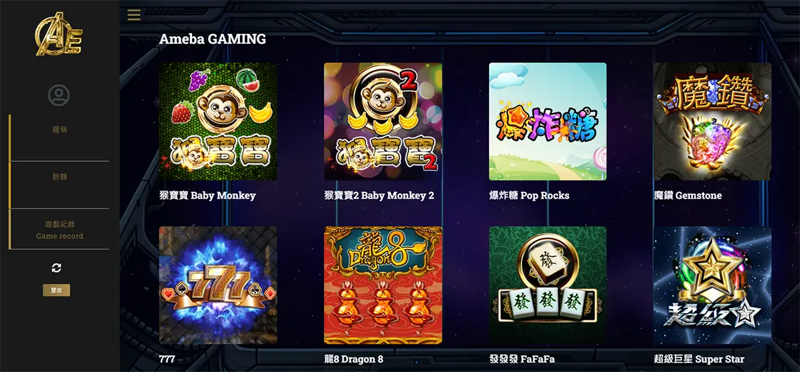 AMEBA電子所有遊戲都是不同數學模型, 目的在於迎合不同的類型的玩家。遊戲強項,消除類(3×3, 3×5)、搖錢樹(搖手機中紅利), 環遊世界(獨立轉)、銀河瘋爆(左右吃線)、魔法球(照顧輸家的心態)等等。超強推廣工具有免費局,自助返水,搶紅包錢,搶紅包免費局,實時錦標賽,並完美整合在遊戏端, 實現一款遊戲裡進行6個推廣活動。