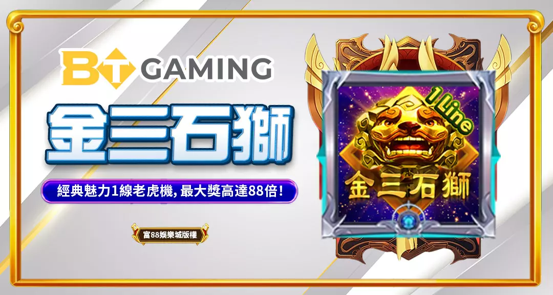 BT電子金三石獅為1X3轉軸設計,這款遊戲回歸到老虎機最原始、最純粹的遊玩形式單一贏分線,只要玩家在畫面上成功轉出三個相同的石獅符號,就有機會贏得令人振奮的高倍彩金,其中金色石獅帶來高達88倍的超高獎勵,是整款遊戲中最具代表性也最令人期待的符號,這樣簡單又直接的中獎機制,讓人每一次按下旋轉鍵都充滿期待。