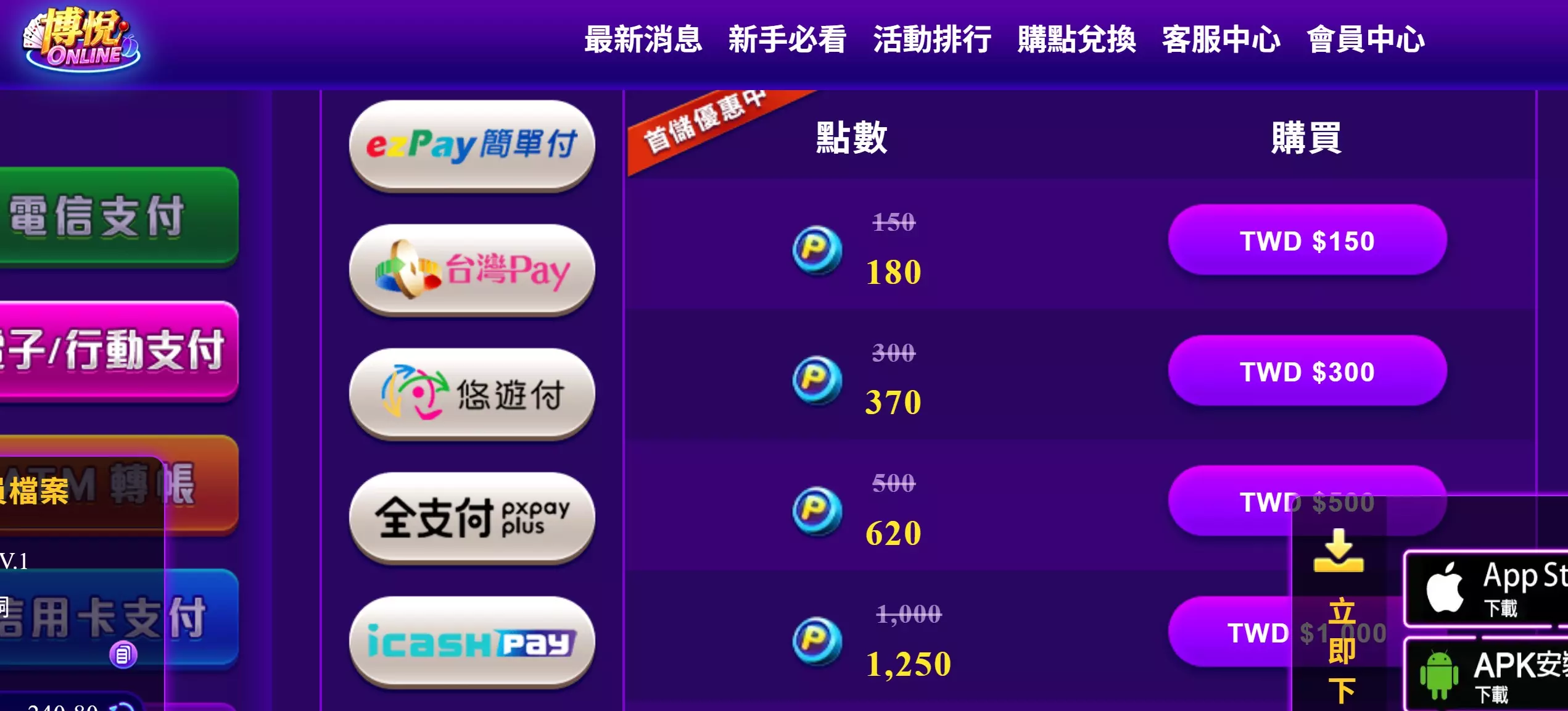 在博悅娛樂城的遊戲體系中,購點制度採用的是遊戲幣轉換模式。以目前平台的兌換比例來看,玩家每儲值150元新台幣,即可獲得180點遊戲幣。這樣的設計與傳統現金版娛樂城1:1的幣值設定明顯不同,因為在博悅娛樂城中,玩家所使用的並非現金進行直接遊戲操作,而是透過平台內部的轉換機制,將現金兌換為遊戲專用的虛擬貨幣。