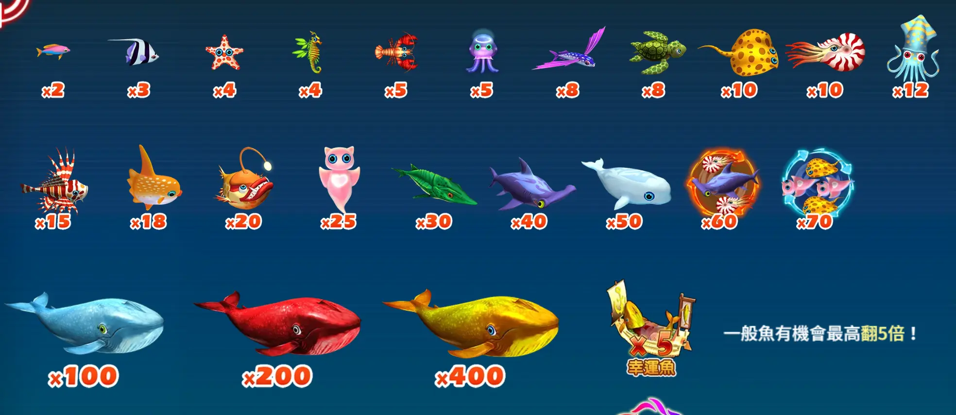 遊戲中特別加入了「幸運魚加乘機制」,簡單來說,就是原本的普通魚類,有機會在被擊中時突然翻倍,最高可觸發x5倍獎勵。舉例來說,一隻原本只有x20倍的海龜,在幸運狀態下有機會變成x100,這種突然出現的暴擊讓整體遊戲充滿不確定與刺激感!