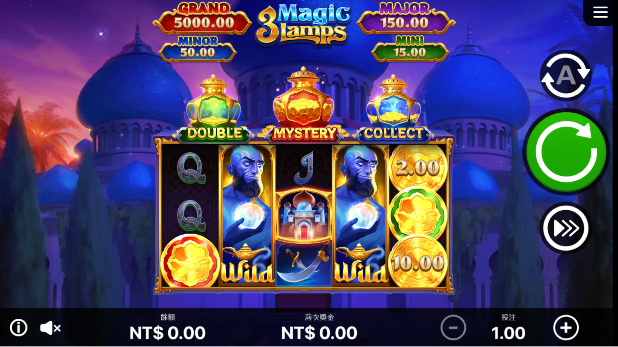 BNG電子3重奏神燈-集鴻運這款遊戲以5軸3排的轉輪結構呈現,畫面背景設計為夢幻藍色的阿拉伯宮殿,搭配閃爍的金幣、神秘的寶箱,以及充滿神力的魔法燈盞,讓人彷彿瞬間進入阿拉丁的傳奇世界。