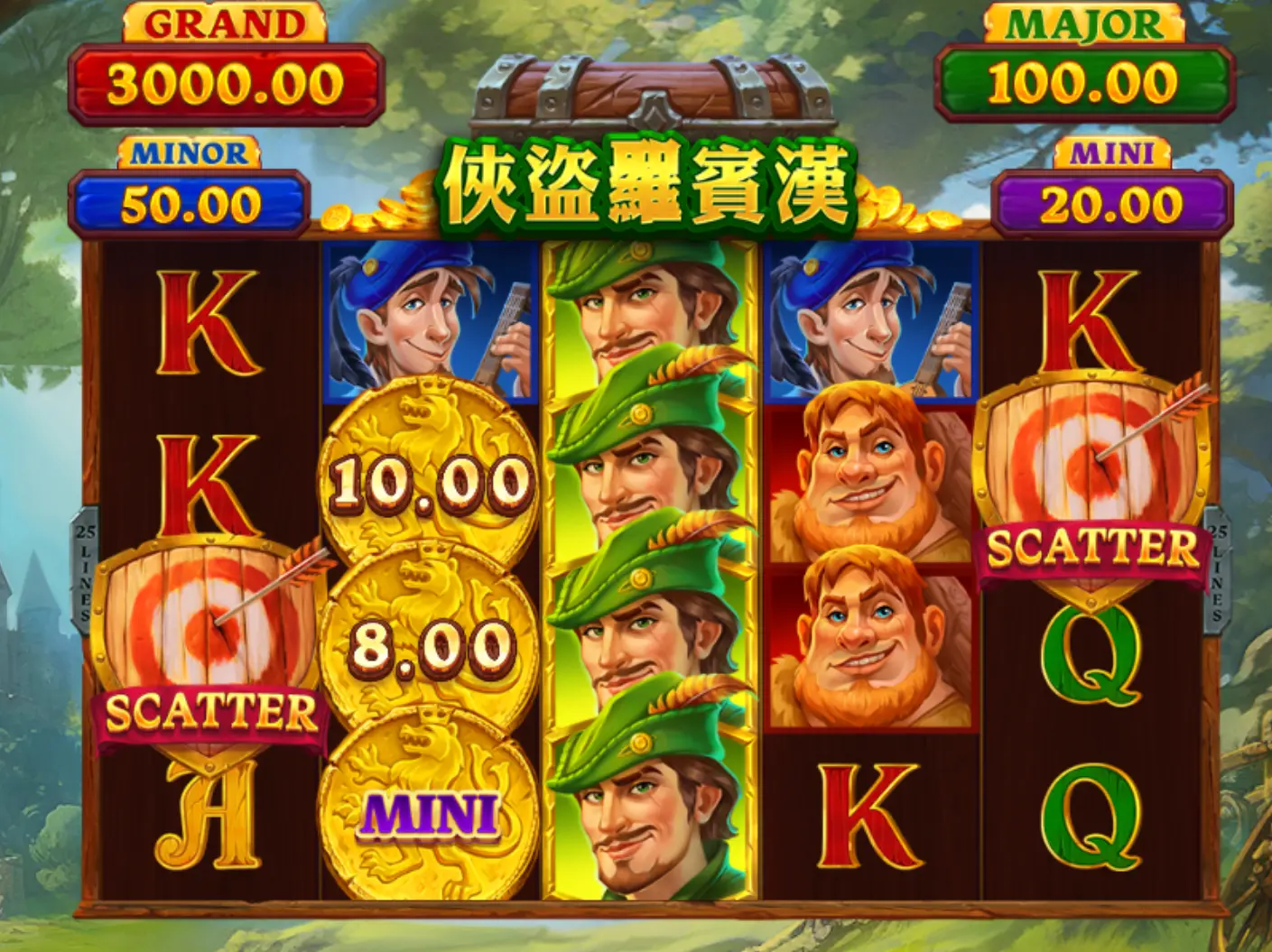 BNG電子俠盜羅賓漢-集鴻運遊戲採用5×3的標準轉輪設計,擁有30條賠付線,簡單易懂又不失趣味。轉輪上充滿了象徵羅賓漢傳說的經典元素,包含弓箭、金幣、標靶以及羅賓漢本人。當標靶Scatter符號出現在盤面上,將會觸發免費遊戲模式,免費旋轉不僅能讓你零成本試手氣,免費遊戲期間BONUS出現的機率大幅提升,讓你更有機會觸發真正的重頭戲集鴻運獎金遊戲。