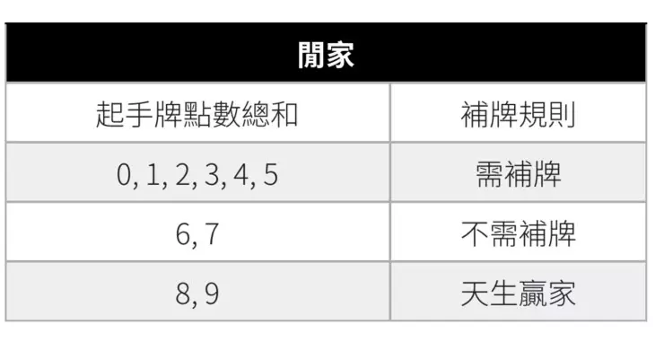 閒家的補牌條件相對簡單,當閒家的手牌點數總和符合以下情況時,則進行補牌,如果閒家的兩張牌總和為0至5點,必須補牌;若閒家的兩張牌總和為6或7點,則不需要補牌,保留原有的牌面;這種情況被稱為「天牌」,表示閒家直接獲勝,不進行補牌。點數為8或9時,不論莊家如何,都無需進行進一步操作。