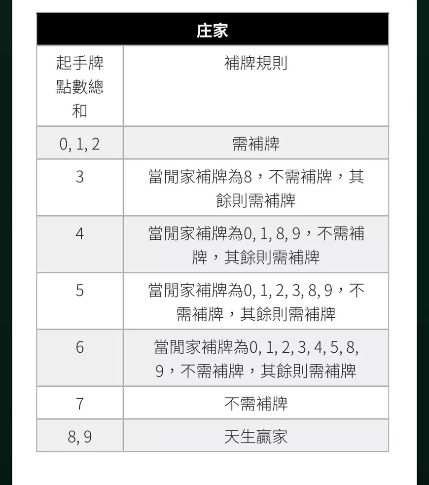 莊家總點數3點,如果閒家的第三張牌是8點,則莊家不補牌;如果不是8點,莊家必須補牌;莊家總點數4點:若閒家的第三張牌是0、1、8或9點,莊家不補牌;其他情況下,莊家需要補牌。