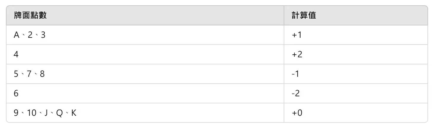 在百家樂的算牌法中,每張撲克牌都有其特定的計分值,這些數值可以幫助玩家在遊戲中判斷目前牌桌的有利情況。以下是百家樂算牌法中每張牌的點數及對應的計算值: